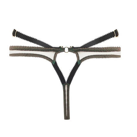 - • Sangle amovible et réglable en tour de taille rappelant les codes du bondage